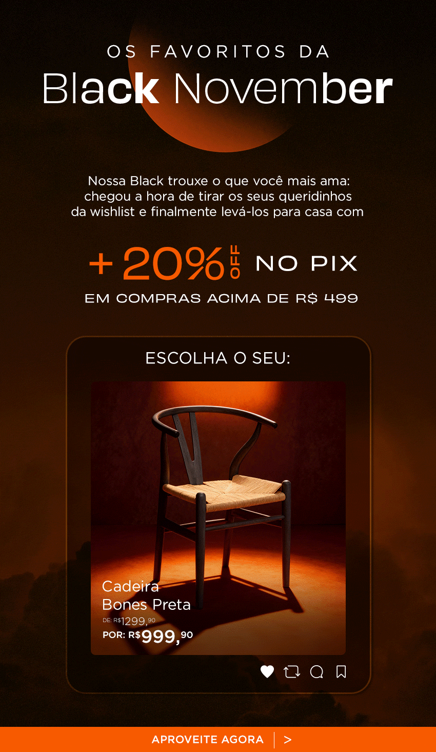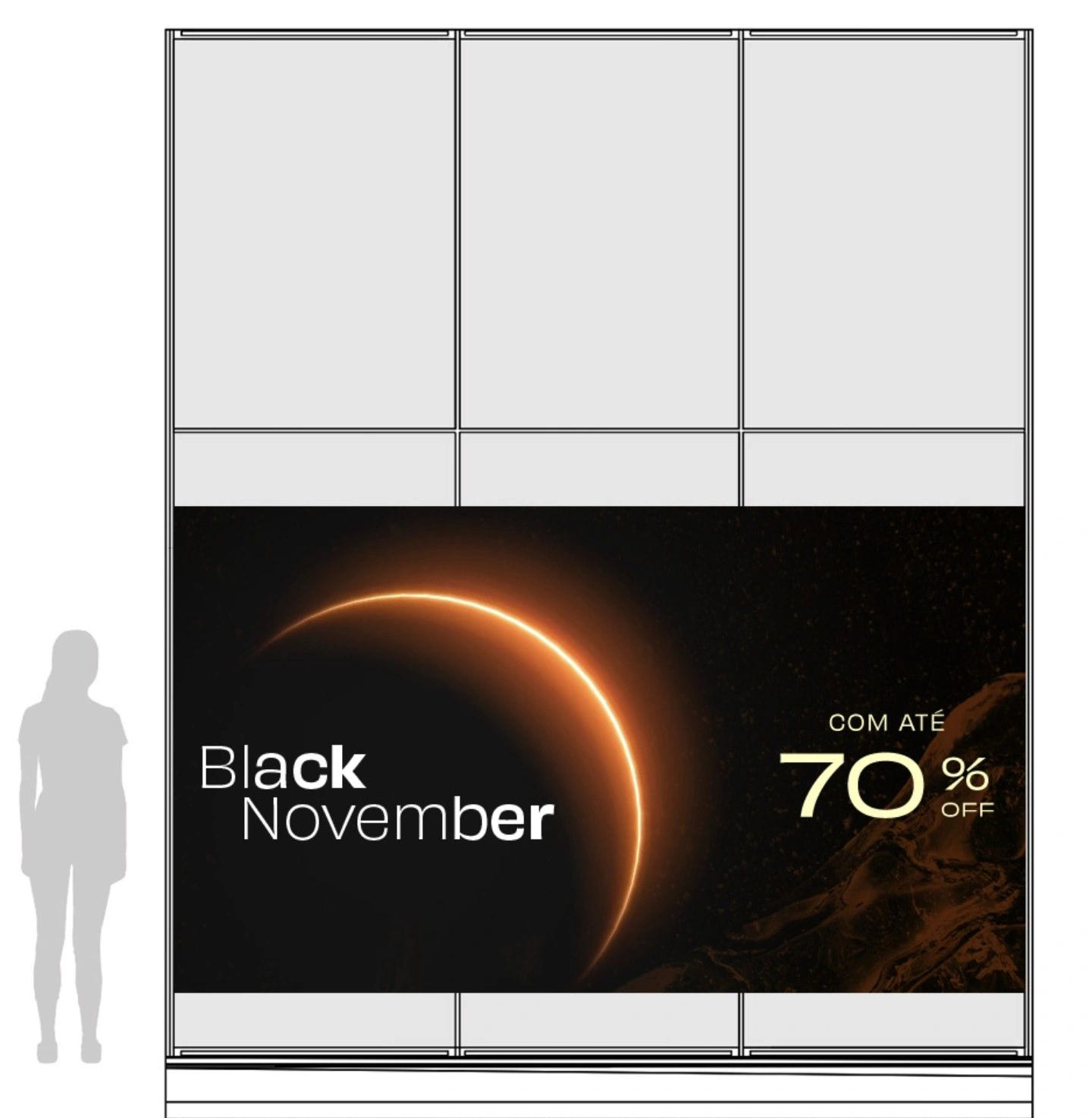 A partir dessa ideia, definimos que o Eclipse é um evento único, passageiro e muito aguardado, que gera muita comoção e euforia. É aquele momento em que tudo escurece para que o destaque fique, única e exclusivamente, no eclipse.Unimos a chegada gradual desse ápice com a força da natureza para criar a identidade visual da Black. E, para fechar esse evento, trouxemos o Sol com toda a sua força para iluminar a Cyber Week!